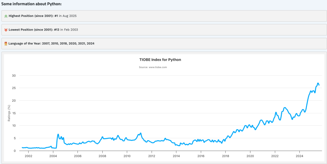 先来看一组数据:2025 年 7 月,Python 在 TIOBE 的得分达到了 26.98%,打破了该榜单自 2001 年创立以来的记录。到了 8 月 4 日公布的新一期榜单,虽然分数稍微降了一点,变成 26.14%,但依然稳稳坐在第一的位置,领先优势明显。