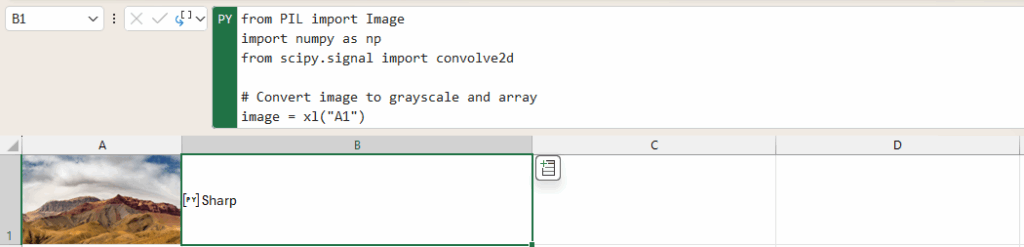 from PIL import Imageimport numpy as npfrom scipy.signal import convolve2d# Convert image to grayscale and arrayimage = xl(“A1”)arr = np.array(image.convert(“L”) dtype=np.float32)# Apply Laplacian filterlaplacian = convolve2d(arr [[0 1 0] [1 -4 1] [0 1 0] mode=same boundary=symm)# Classify based on variance“Blurry” if np.var(laplacian) 100 else “Sharp”