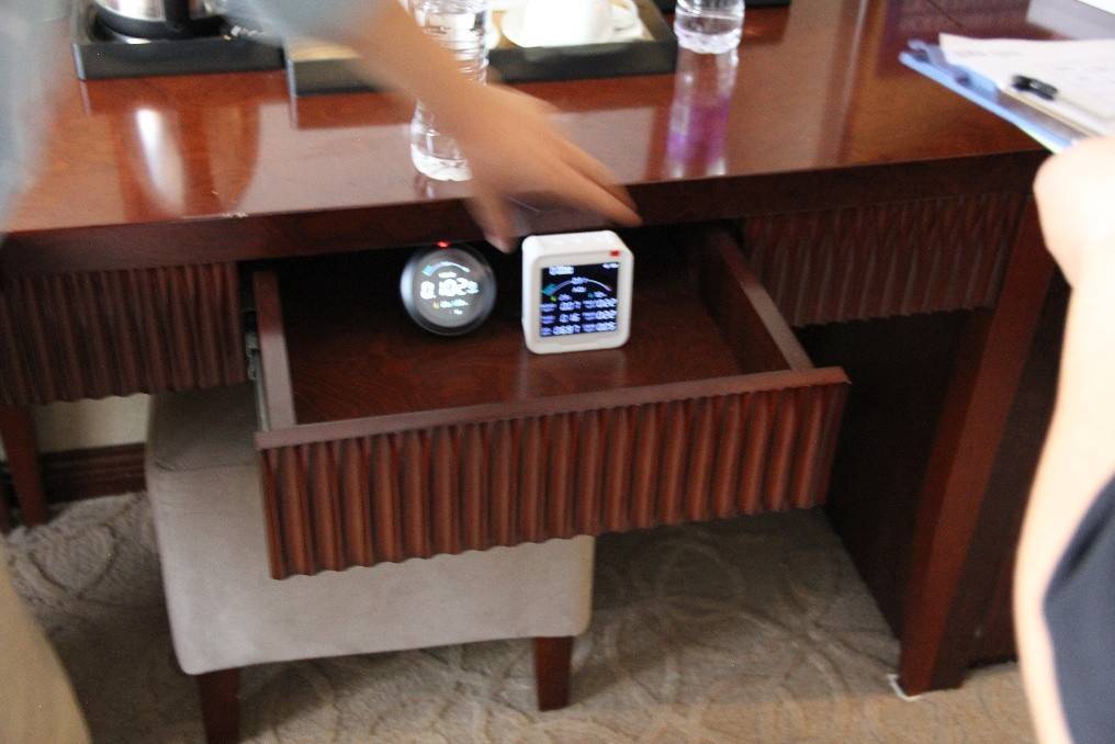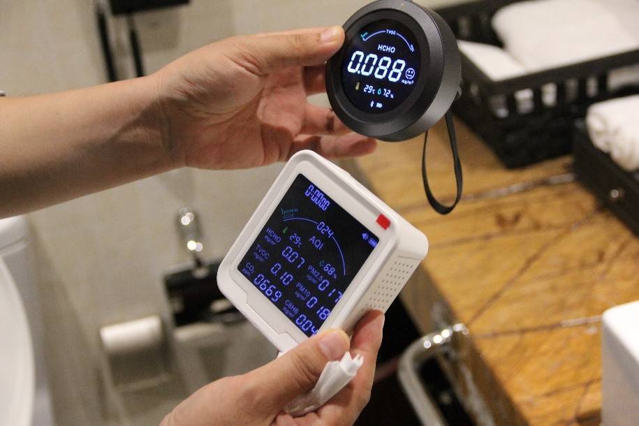 酒店客房的异味本质是TVOC(总挥发性有机物)、甲醛等挥发性物质的混合释放。客房因装修材料老化、清洁不彻底,这些污染物更易累积。检测第一步,用兰芯源甲醛检测仪HZ01A和综合空气质量检测仪HZ02M采集建立各检测点数据,掌握客房整体污染水平。