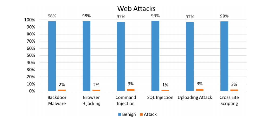 Web 攻击检测:在流级检测模式下,对于各类 Web 攻击,召回率均达到 100%,F1 分数普遍高于 0.99。即便仅基于 CICIoT2022 数据集构建基线(该数据集中部分设备信息有所缺失),数据包级检测的召回率依旧维持在 90% 以上。例如,在针对 Command Injection 攻击检测时,流级检测的精确率为 0.99,召回率 100%,F1 分数 0.995;数据包级检测精确率 0.98,召回率 92%,F1 分数 0.95,如下图所示Web 攻击中不同检测方式的性能对比。横坐标为 Web 攻击类型,纵坐标为性能指标数值。以柱状图展示数据包级检测和流级检测在精确率、召回率、F1 分数上的表现,直观呈现两种检测方式在各类 Web 攻击检测中的差异。