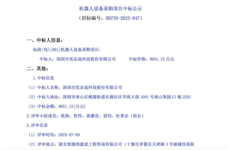 而后没过多久,中国招标投标公共服务平台发布的《机器人设备采购项目中标公示》显示,优必选已中标觅亿(上海)汽车科技有限公司(下称“觅亿汽车”)的机器人设备采购项目,项目金额为 9051.15 万元。和智元、宇树不同,此次优必选独家拿下近亿订单——这是目前公开信息中,全球人形机器人企业单家公司单笔中标金额最大的采购订单,再次刷新了人形机器人单笔订单记录。