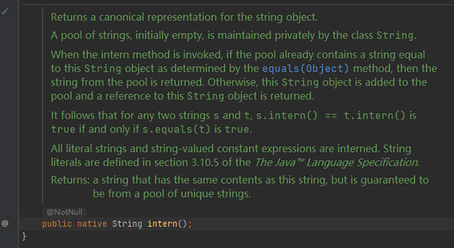 当调用intern方法时,如果池子里已经包含了一个与这个String对象相等的字符串,正如equals(Object)方法所确定的,那么池子里的字符串会被返回。否则,这个String对象被添加到池中,并返回这个String对象的引用。