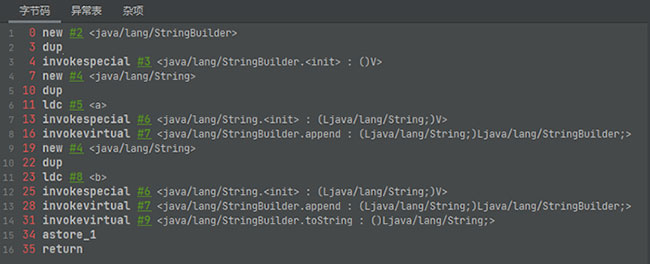 我们拿例4的字节码进行查看,可以发现s1 + s2实际上是new了一个StringBuilder对象,并使用了append方法将s1和s2添加进来,最后调用了toString方法赋给s4