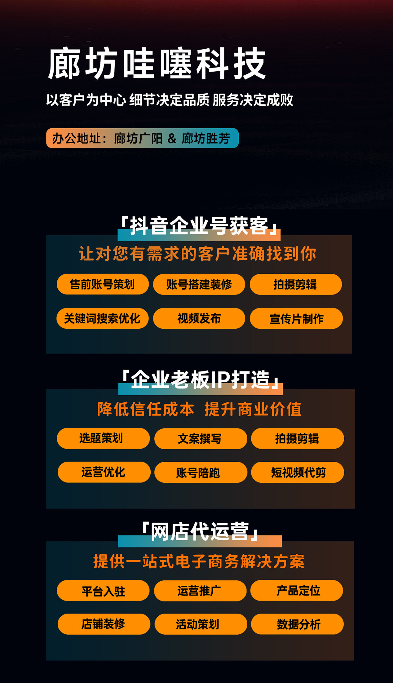 公司秉持真诚服务、共赢长存的经营理念,主营企业互联网推广、短视频账号运营、拍摄剪辑、矩阵运营、商家账号搭建、运营培训、新媒体团队孵化、网店代运营及客服外包等业务。哇噻科技凭借利他准则,与每一家合作企业商家结成挚友,共同稳健拓展电商之路。