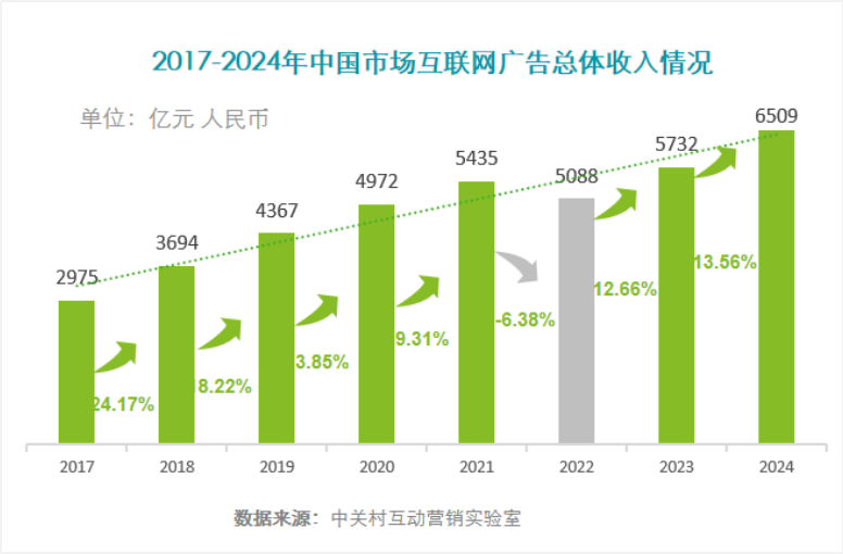 - 2024年中国互联网广告市场规模预计将达到6,509亿元人民币,同比增长13.55%,连续两年实现增长,且增速较去年加快近一个百分点。这一稳健的增长态势,不仅体现了市场结构化调整与资源优化配置的成效,也是在整体市场压力较大的背景下,各营销企业不断创新的结果。