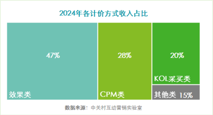 在计价方式方面,各类型市场基本实现均衡增长,其中效果类广告相对增速较快,有15.60%的提升,市场份额小幅增加到47.29%,CPM类和KOL采买类广告整体规模也保持温和增长。