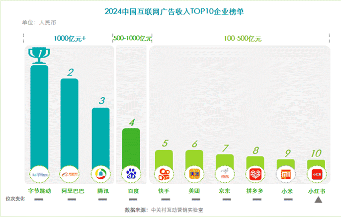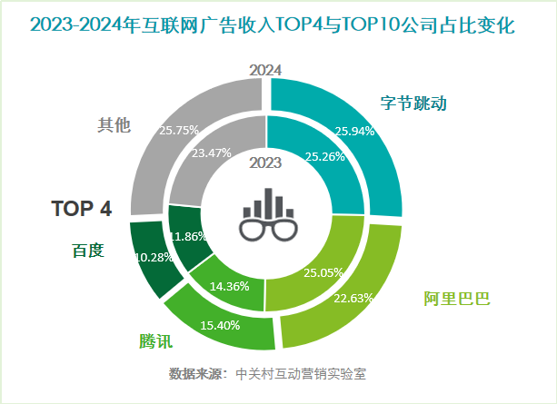 另据数据显示,2024年行业前三的企业(字节跳动、阿里巴巴和腾讯)广告收入均已突破1000亿元大关,持续呈现强势增长态势,并与第四的企业拉开差距,标志着互联网广告市场规模愈加集中。前十大平台收入全部超过百亿。但互联网营销市场的结构性调整与创新是企业无法规避的挑战。