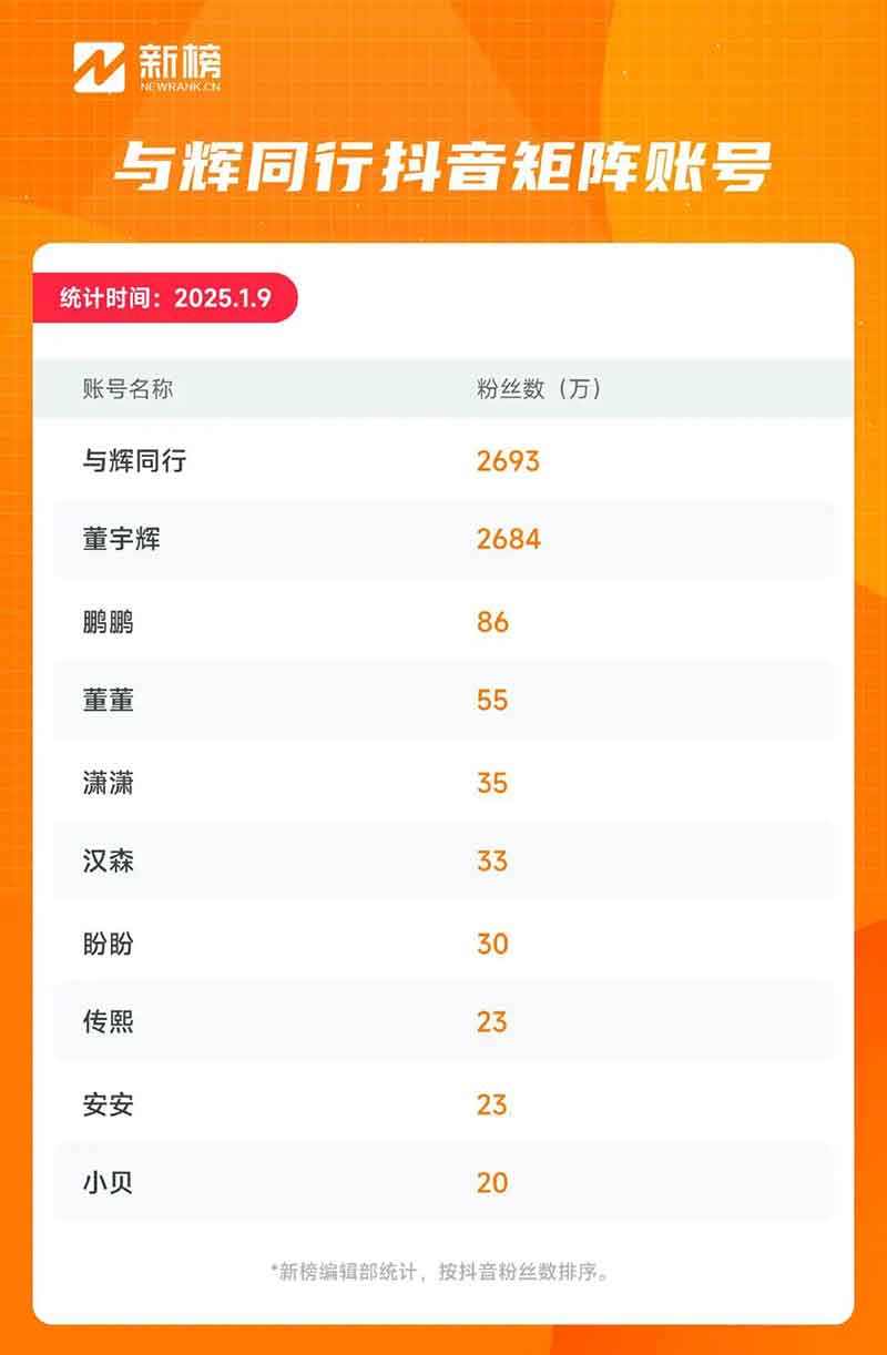 新榜旗下抖音数据工具新抖统计,过去一年(2024.1.9-2025.1.8),“与辉同行”在抖音累计带货超102亿,累计订单量超1.6亿。同一时间内,“与辉同行”累计涨粉2012万,“董宇辉”累计涨粉293万。目前,“与辉同行”和“董宇辉”两个账号的累计粉丝数达5382万。数据显示,“与辉同行”是2024年抖音预估带货销售额最高的直播间。