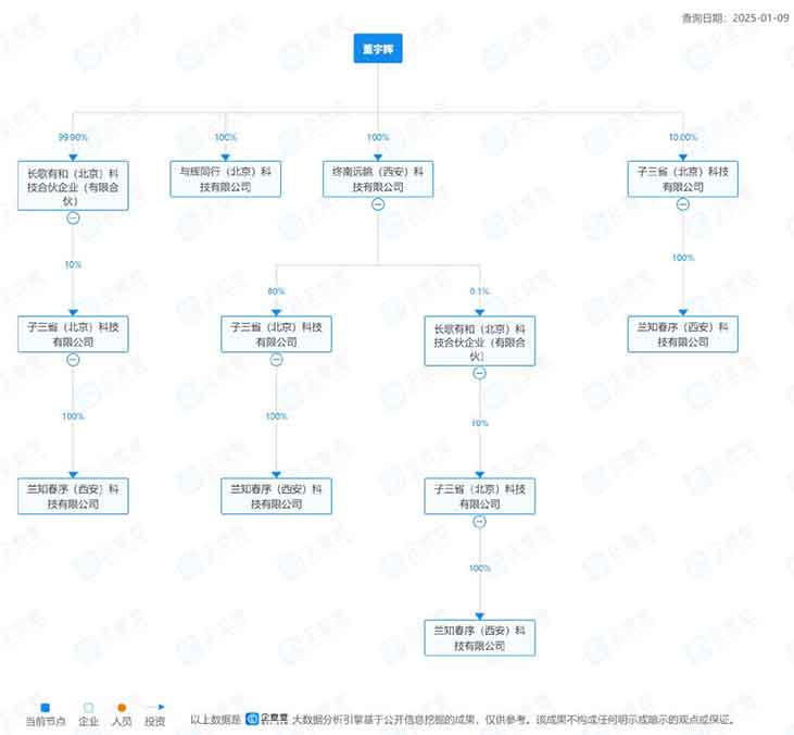 此外,企查查显示,过去一年,与辉同行之外,董宇辉名下新增了长歌有和、中南远眺、子三省、兰知春序4家新公司。不久前,与辉同行还与西安浐灞国际港签署文旅总部项目合作协议,未来双方将依托西安历史文化,进行更多文旅方向的合作。