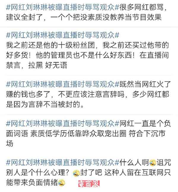 后续,刘琳琳不当言论的录屏视频在各大社交平台传播,网友“建议平台封杀刘琳琳” 的呼声颇高。
