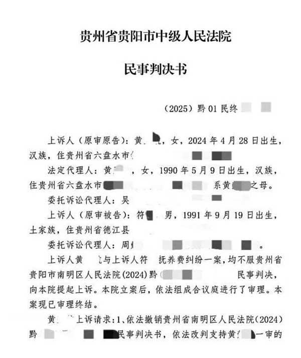 直至上月,贵阳市中级人民法院作出终审判决,维持一审中关于符某从2024年4月起支付其非婚生女儿黄某航生活费1100元/月,直至其年满18周岁的判决,同时判令符某承担2400元鉴定费用,撤销一审关于符某5日内支付黄某产检费的判决。