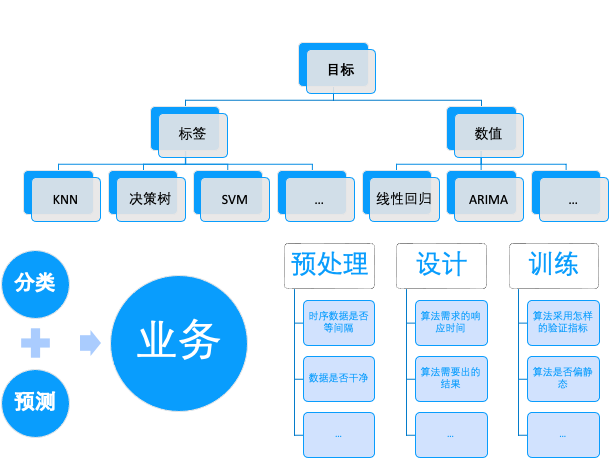 很多时候大家提到算法就想到深度学习,大模型,其实忽略了一个重点,算法是为了解决业务问题而存在的。虽然算法能力的多样性和全面性,在其他条件相同的情况下,是与复杂度正相关的。但一个能够解决需求的简单算法,从开发成本、时间投入、适配场景、迁移难度等多方便因素考虑都是比一个复杂算法更优秀的。因此,算法的开发更推崇由简至繁,当不能满足需求时,再节节升级。常见的传统算法根据我们的目标是标签类的还是数值类的,可以简单分为分类算法和预测算法,里面有很多经典思路更是经久不衰。值得注意的是,在创造算法时我们要关注许多问题,比如工作量最大的预处理阶段,我们要注意时序数据是否满足一些基本的要求,比如相对稳定、时间间隔相等、数值是否符合业务逻辑等等,需要对原始数据进行对应的预处理,在保证干净可用的同时尽量不丢失重要的原始信息。比如设计时要搞清楚业务上到底需求一个怎样的结果和响应时间,是否存在合适的数据和模型是否能够支持。训练时也要考虑算法该如何使用历史的数据或故障信息来得到一个具有相对普适性的模型,采用怎样的指标验证,模型能力是否相对静态,如果是有输入反馈如何进行迭代等种种问题。解决这些问题的方法和模型的选择都不一定只存在唯一解,开发算法时应该凭借经验给出最合适的算法范围或解决手段,然后勇于尝试。