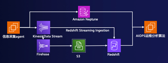 - 运维分析算法通过 Redshift 中的异常信息数据,Amazon Neptune 中分布在全球的设备关系图谱数据,进行聚合分析,并将维护操作下发,和运维人员操作告警