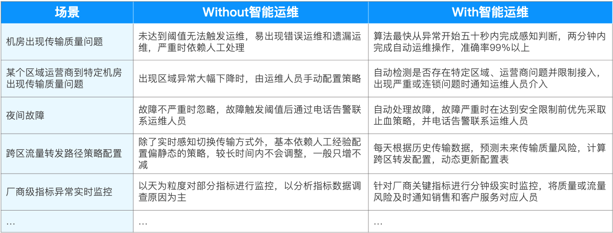 传统的运维方法使用绝对水位或逻辑条件的方式进行机房质量监控,这种监控虽然能够识别一些质量异常,但存在着漏警误警严重、维度单一等问题,针对靠近阈值的报警缺少辨别能力,对于非常规质量异常的传输质量指标曲线也缺乏识别能力。而智能运维,正好可以弥补传统运维的不足。