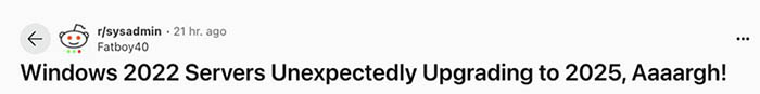 今天早上来到位于英国的一家中型企业的办公室时,感觉有点不对劲。进一步调查发现,我们的所有 Windows 2022 服务器要么已经在夜间自动升级到了 2025 版,要么正准备升级。这显然让我们感到很震惊,因为我们还没有到达要进行这样的升级的阶段,而且所需的许可也没有准备好。