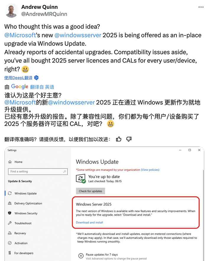 这两天,不少 IT 管理员、运维涌入社交媒体平台发文控诉,自家的“Windows Server 2022 意外自动升级到了 2025,啊啊啊!”
