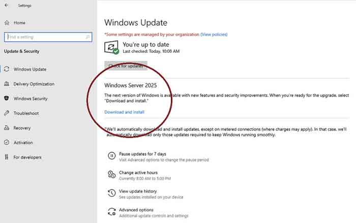 检查我自己的 2022 服务器,是的,微软显然允许你直接从 Windows 更新菜单升级到 2025: