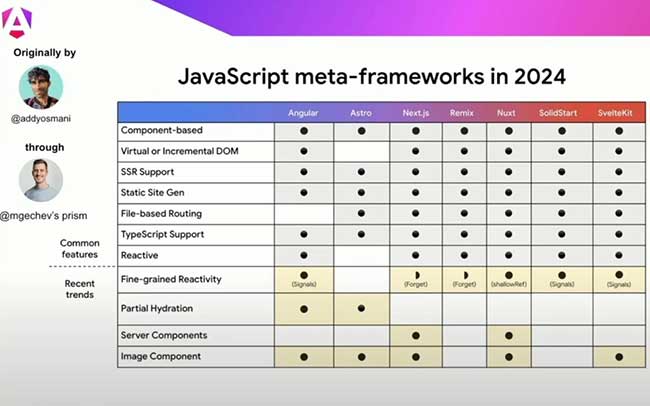 Chrome 首席工程师 Addy Osmani 在 2024 年的谷歌 I/O 开发者大会上分享一个表格,从 Web 开发者的角度看每个框架中可用的功能。Gechev 对这个表格做了一些修改,以反映他自己的观点,即各个框架正在融合相同的功能。