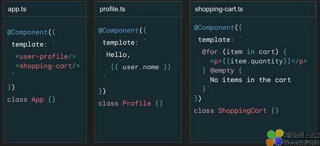 他例举了另一个例子:一个应用程序组件使用了另外两个组件——用户资料和购物车。个人资料组件显示用户名,购物车组件遍历购物车中的物品,并显示每个物品的数量。