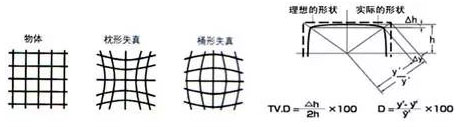 失真为光学轴外的直型物体,呈现曲线时的镜头像差。镜头失真也称为镜头畸变,即光学透镜固有的透视失真的总称,可分为枕形失真和桶形失真,直线朝向中心的失真情况为枕形失真(Pincushion Distortion),向外扩张的失真称为桶形失真(Barrel Distortion)。如下图示: