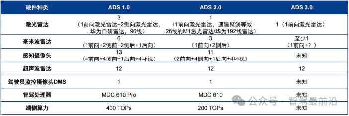 激光雷达的减少:从ADS 1.0的3个激光雷达到ADS 2.0和ADS 3.0的1个激光雷达,虽然传感器数量减少,但华为通过技术提升增加了单个激光雷达的覆盖范围和分辨率,使其感知效果更加出色。