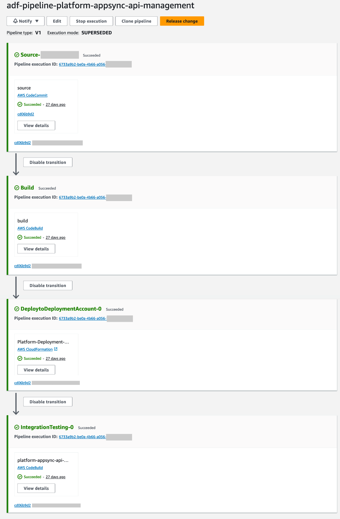 图 7. 使用亚马逊云科技 CodePipeline 为平台级应用程序”AppSync API Management”自动生成的管道,包括构建和测试阶段