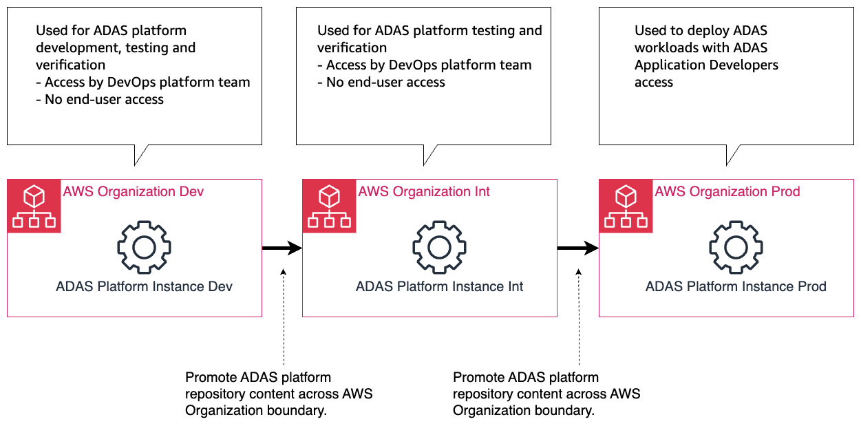 每个亚马逊云科技组织都包含下一代 ADAS 平台的一个完整实例。Dev 和 Int 亚马逊云科技组织服务专门由下一代 ADAS 平台开发运维团队用于平台开发和测试,而 Prod 亚马逊云科技组织服务则用于为 ADAS 应用开发人员部署 ADAS 工作负载环境。这种设置使得新的平台功能开发不会影响 Prod 组织服务实例的稳定性。下图展示了多亚马逊云科技组织服务的方案:
