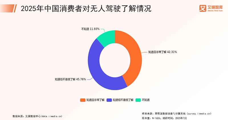 数据显示,在2025年中国消费者对无人驾驶的了解情况中,占比最高的是“知道但不是很了解”,达到45.76%,说明大多数消费者对无人驾驶有一定认识,但缺乏深入了解。其次是“知道且非常了解”,占比为42.31%,这部分消费者对无人驾驶有较充分的了解。占比最低的是“不知道”,仅占11.93%,表明绝大多数消费者已经接触到无人驾驶的概念。整体来看,中国消费者对无人驾驶的认知度较高,但仍有提升空间。