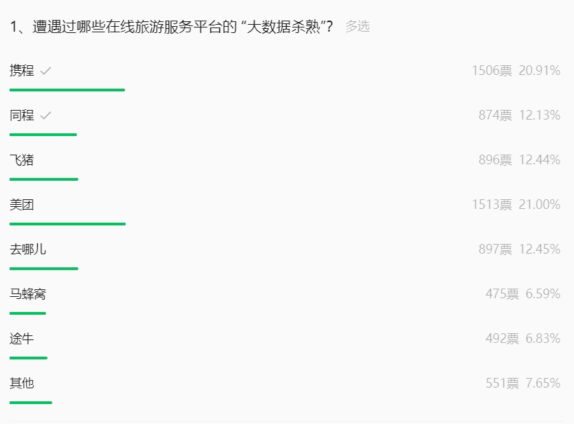 在“遭遇过哪些在线旅游服务平台‘大数据杀熟’?”的选项里,美团票数为1513票,占比21%,携程票数为1506票、占比20.91%,去哪儿票数为897票,占比12.45%;飞猪票数为896票、占比12.44%;同程票数为874票、占比12.13%。