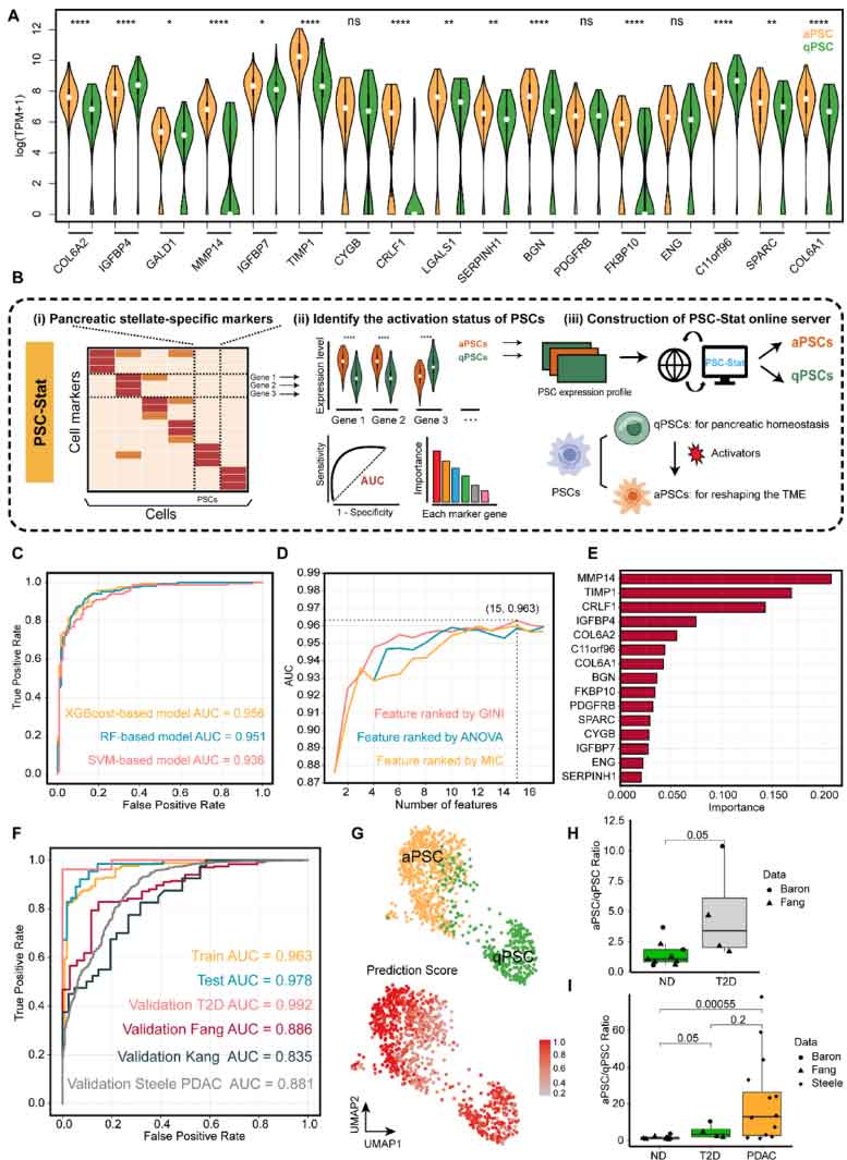 基于新发现的标志基因,PSC-Stat工具揭示MMP14、TIMP1是区分静止型(qPSC)与激活型(aPSC)星状细胞的关键因子。在疾病进展中,aPSC/qPSC比值呈指数增长:从健康人的1.44激增至PDAC患者的18.67,这为"糖尿病可能是PDAC早期征兆"的临床观察提供了单细胞证据。