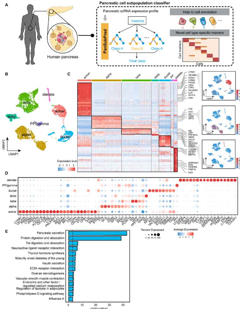 电子科技大学生命科学与技术学院的研究团队在《Cardiovascular Diabetology》发表的研究中,创新性地融合单细胞测序与机器学习技术,绘制了T2D胰腺的多谱系分子图谱。研究通过开发两阶段特征选择的PanSubPred分类器,实现了对7大类胰腺细胞的高精度注释;利用XGBoost算法构建的PSC-Stat工具则定量解析了星状细胞激活动态。研究整合了来自GEO和ArrayExpress的8个独立数据集,涵盖19名非糖尿病(ND)和9名T2D捐赠者的胰岛样本,采用Seurat进行质控和聚类分析,通过CellCall等算法重构细胞互作网络,并运用Monocle和scVelo解析细胞分化轨迹。