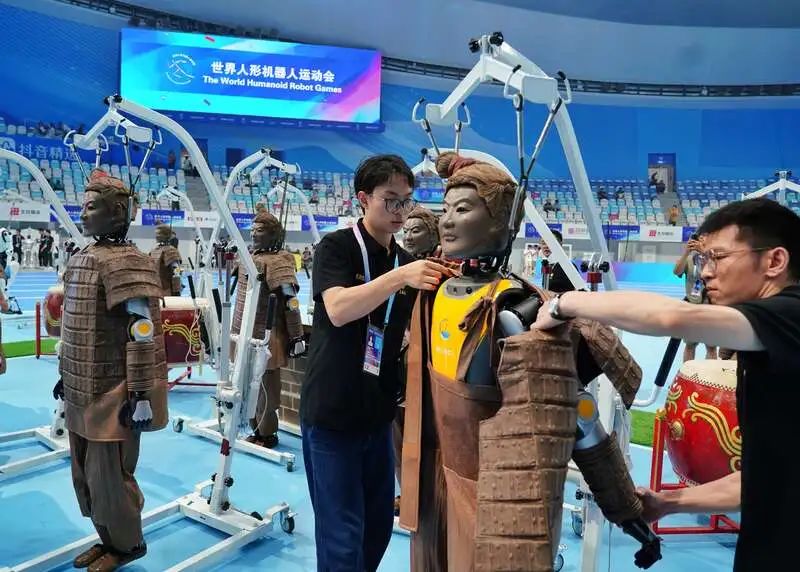 此次运动会首金所在的群体舞蹈项目中,北京舞蹈学院与湖北光谷东智具身智能技术有限公司组成联合代表队派出9台全尺寸“兵马俑”机器人与真人舞者协同改编经典舞蹈《秦俑魂》,夺得首金。