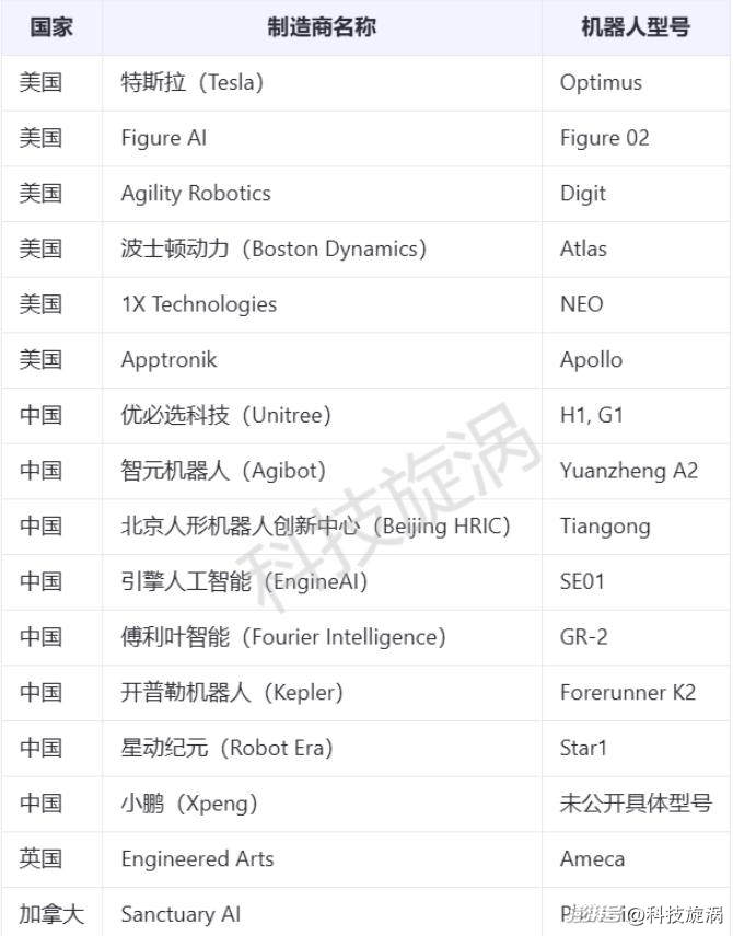 迪曼迪斯特别指出,当前全球机器人制造领域的竞争尤为激烈,而中国企业已经成为不可忽视的重要力量。在全球顶级的16家机器人制造商中,有一半来自中国。以下是他列出的全球领先的人形机器人制造企业及其产品型号: