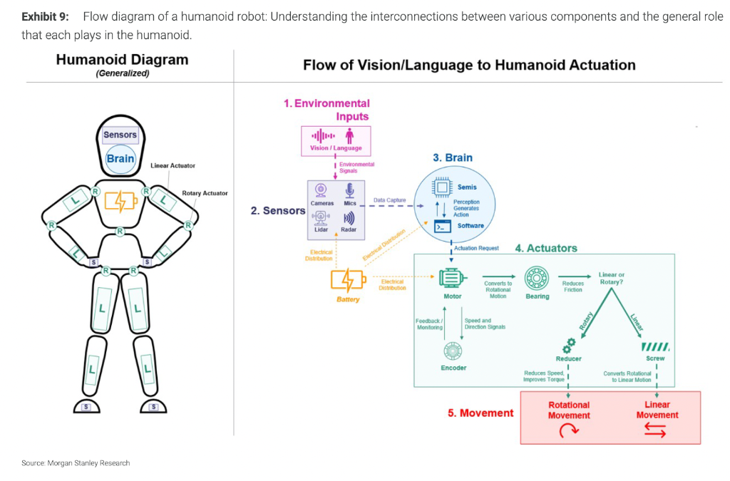 报告表示,人形机器人的"身体"主要由传感器、执行器、电线和连接器网络以及锂离子电池组成,外部通常由铝合金和塑料混合制成,以最大限度地减轻重量。